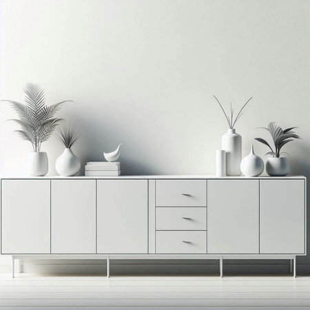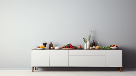 the sideboard stands elegantly in the serene grey interior, its sleek design and minimalist aesthetic blending seamlessly with the light colors that surround it, creating a sense of calmness and sophistication, perfect for a modern living room or dining area decor. ai generated