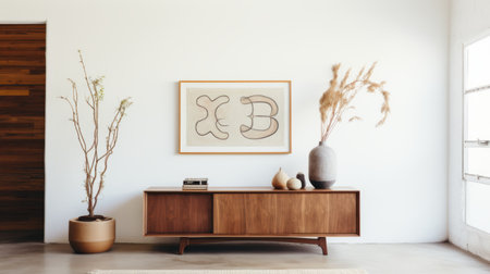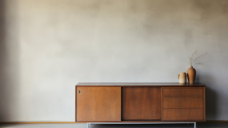 A photograph of a sideboard with a white wall behind it, in a mid-century modern style, with warm tones, a front view, as a product photograph, against a white background, with a minimalistic, clean, and simple design. --ar 3:2 --v 6.1 Job ID: 26224c8e-af2d-49b5-b458-dbdf78498eb8