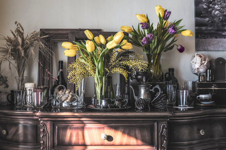 Various items and glassware, as well as bouquets of tulips and mimosas on a Victorian dresser