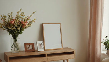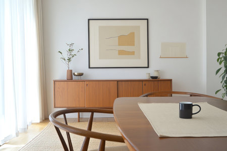 A photo of a large white wall with two thin black frames on the wall, one is blank and the other has a painting inside it. The frame hangs above an elegant mid-century modern dining table with chairs around it. There's also a wooden sideboard against the background. In front, there's an empty beige linen desk mat with a mug on top of it. The room feels cozy yet minimalistic in style, inspired by Japandi. Soft, warm lighting and natural materials like wood and fabric create a calm ambiance. Scandinavian design. --ar 3:2 --v 6.1 Job ID: 160e9abe-76f6-44ca-956f-ffb8df9e93df