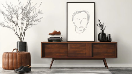 A framed drawing of an abstract face is hanging on the wall above the sideboard in a modern, Scandinavian-style interior with light walls and minimalist decor. The wooden cabinet has leather shoes, books, and a vase with black flowers, creating a cozy ambiance. The artwork features a minimalist art style, simple line drawings, flat colors, and a focus on details. --chaos 30 --ar 16:9 --v 6.1 Job ID: c8ea7ed5-6a88-4aec-b9e1-6f4800c28ee6