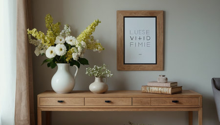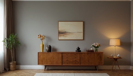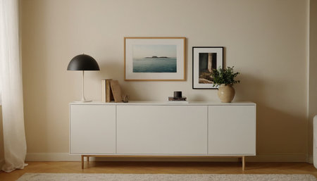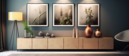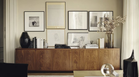Stylish living room interior showcasing a minimalist gallery wall and elegant oak cabinet, creating a serene atmosphere filled with artistic decor.