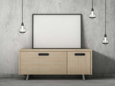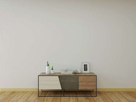Interior of modern living room with white walls, wooden floor and chest of drawers. 3d render