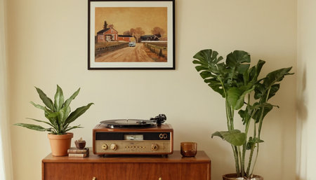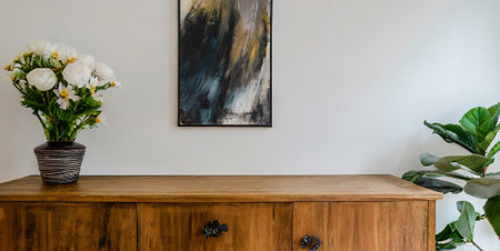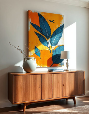 A stylish interior showcases a white cabinet with colorful wall art above it. Additional decor includes a plant and various vases, enhancing the room's aesthetic appeal.