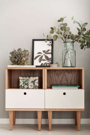 Interior design decoration of living room with wooden chest of drawers, lamp and vase with dried flowers
