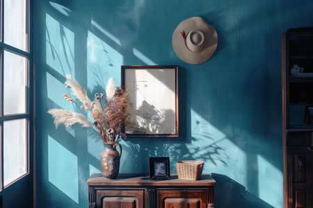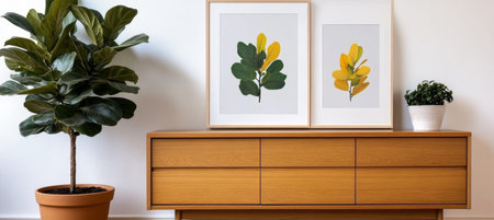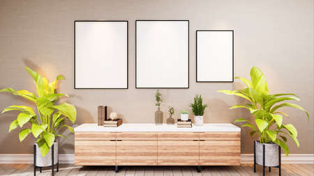 Interior of living room with wooden chest of drawers, plants and mock up poster frame