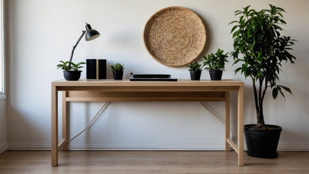 A clean and organized workspace features a wooden desk adorned with potted plants and a decorative basket on the wall. Natural light illuminates the serene atmosphere.