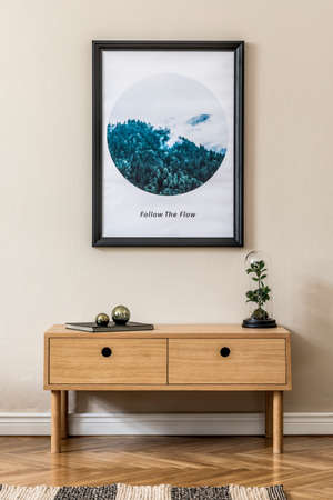 Interior design of living room with wooden commode, book, plant in glassy box and elegant accessories. Stylish home staging. Template. Mock up poster frame. Japandi and minimalistic concept.