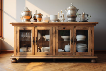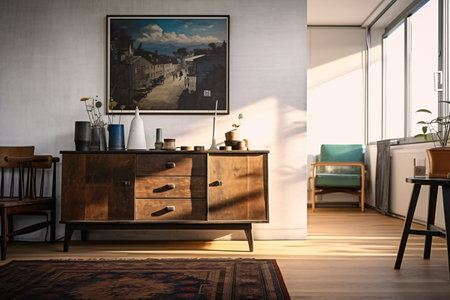 the wooden sideboard, in the style of light red and amber abstract minimalism, is positioned next to a wall adorned with a painting. this midcentury modern piece showcases traditional craftsmanship and its calm and serene beauty is enhanced by the quirky pottery displayed on top. captured in stunning 8k resolution, it is a true appreciation of art and design. ai generated