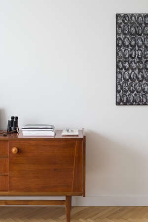 Interior of modern living room in a Scandinavian style with Wooden chest of drawers and houseplant.