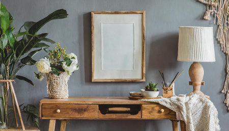 Design home interior of living room with stylish chair and wooden desk, plants, flowers, table lamp, mock up poster frame, macrame and elegant accessories. Stylish home decor