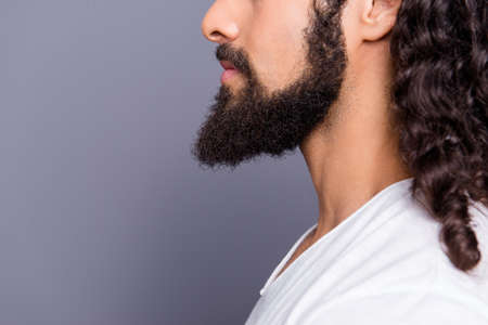 Close-up cropped profile side view portrait of nice well-groomed attractive calm wavy-haired guy mustache big beard isolated over gray violet purple pastel background.