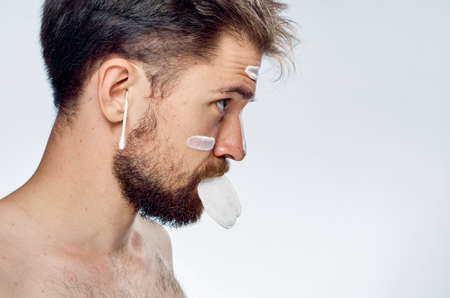 Young guy with a beard on a white isolated background, cotton pads, cosmetic cream.