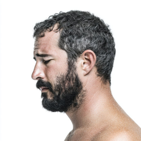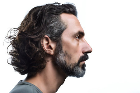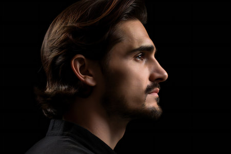 A striking profile view of a man with a beard and short hair, reflecting strength and confidence in a clean and minimalist backdrop that emphasizes individuality.