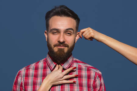 Young man in sweater pointing fingers to head as if he about shoot himself isolated on grey background Studio photo