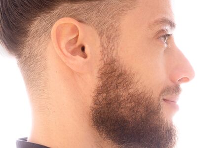 Handsome bearded male model posing at camera. Young adult man isolated on white background, close up shot. Natural beauty skin care concept. Side view.