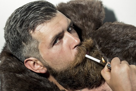 Portrait of sexual unshaven man with long beard and moustache in brown fur coat with collar lying in white bath tub and smoking cigarette, horizontal picture