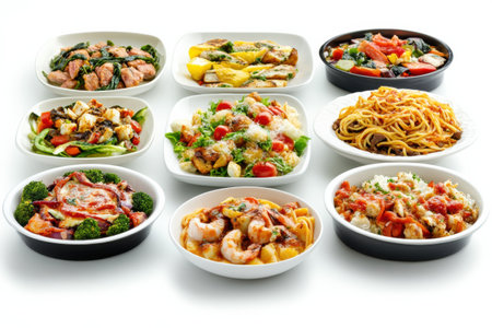 A selection of Italian, Japanese, and Mexican dishes beautifully arranged on a white surface, showing vibrant colors and appealing presentation.
