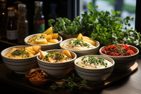 Upper view of different delicious salads with cream soups and chips on the table, generative AI