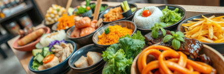 A captivating food stall features an assortment of vibrant bowls filled with noodles, sauces, and fresh vegetables, inviting culinary exploration and enjoyment.