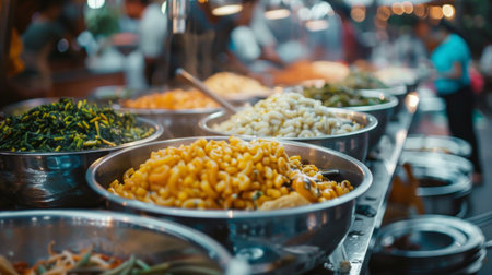 A bustling street food market with various dishes in metal bowls, showcasing a variety of colorful and appetizing foods.
