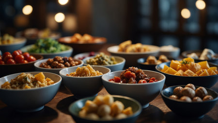 Colorful spread of assorted dishes featuring fresh ingredients and vibrant flavors in a modern dining setting