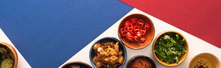 horizontal concept of bowls with korean spicy side dishes and oil on blue, crimson and white