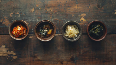 A vibrant display of assorted pickled vegetables and sauces in small ceramic bowls, showing a variety of colors and textures, perfect for culinary exploration.