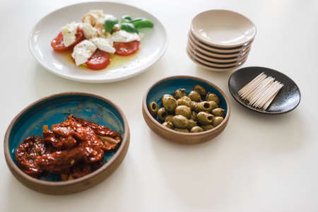 Mozzarella and tomatos with basil, dried tomatoes and olives on turqouise plates