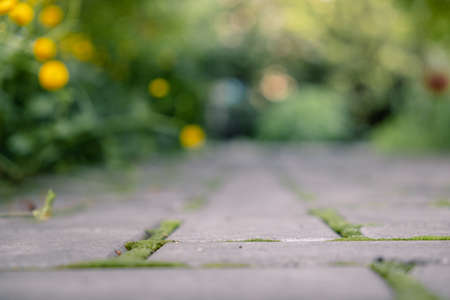 buttercup, yellow flowers growing along a cobblestone path with sprouted green moss. blurred background. home gardening. landscape design.