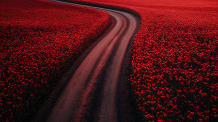 A breathtaking view of a winding road surrounded by an expansive field of vibrant red tulips, capturing the essence of spring and natural beauty.