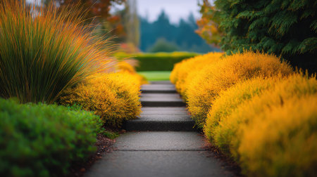 A picturesque garden pathway framed by vibrant autumn foliage and lush greenery invites visitors to explore this serene outdoor setting brimming with beauty.