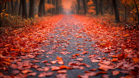 AI Generated. Autumn Pathway Covered with Fallen Leaves Featuring Soft Lighting and a Blurry Foreground Symbolizing the Peacefulness and Tranquility of Fall