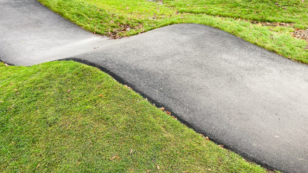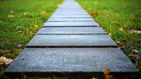 A serene walkway paved with tiles stretches through a lush green park. Ideal for nature lovers, this image captures a tranquil path, inviting exploration and relaxation.