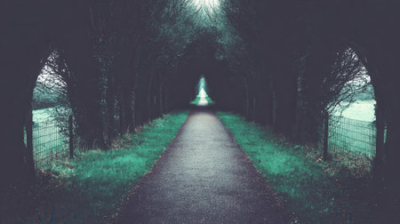 Gloomy tunnel of trees forming a canopy over a path with a distant bright light