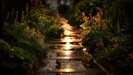 Wet path in the garden at night. Selective focus.