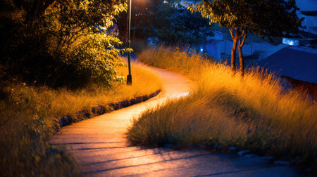 A winding pathway illuminated by a warm streetlight, surrounded by lush grass and trees, creates a tranquil atmosphere for evening strolls.