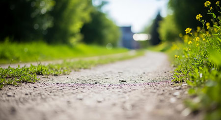 AI Generated. Gravel road with orange line and scattered stones surrounded by greenery in soft focus perspective copy space