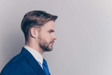 Side profile view portrait of smart experienced qualified clever strict head on big company clothed in black jacket and white shirt looking aside isolated on gray background copyspace