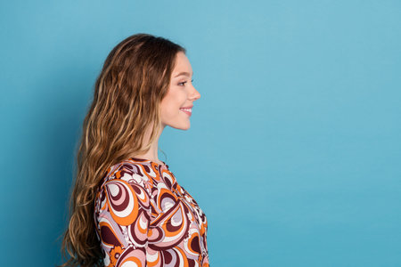Profile portrait of cheerful charming lady white smile look empty space on blue background