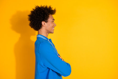 Photo portrait of handsome young guy crossed hands profile dressed stylish blue garment isolated on yellow color background