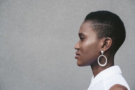 attractive young african american woman with earring posing in profile surrounded by vibrant lights