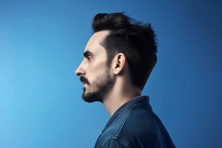 Profile portrait of serious self assured unsmiling man with beard in blue shirt seriously looking far away, confidence. Indoor studio shot isolated on white background