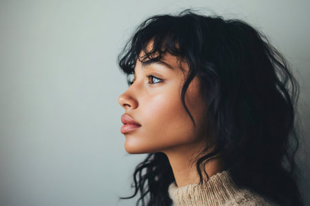 Woman's profile with curtain bangs and curly hair, wearing a knit sweater against a plain background, contemplating