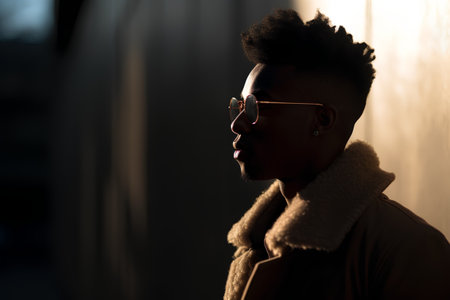 Stylish man posed in natural sunlight and deep shadows, creating a minimalist, artistic portrait with strong contrast and modern tone.