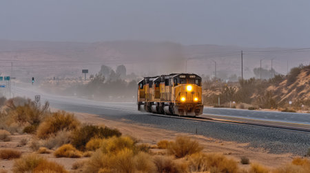 Freight train moves through a desert landscape under overcast skies, kicking up dust along the roadside, showcasing transportation in an arid environment.