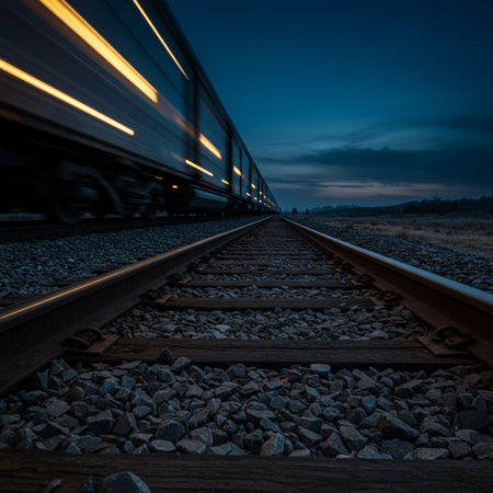 Train on railroad tracks at night with motion blur, long exposure.