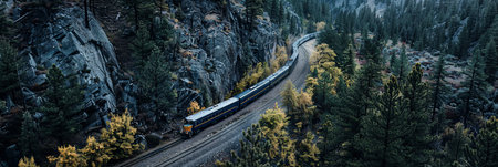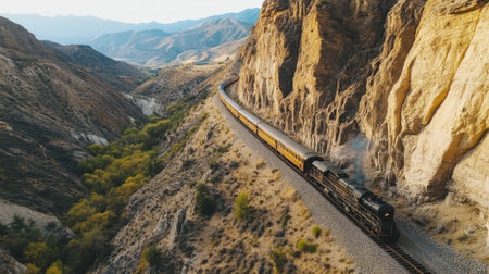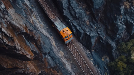 Drone footage of a railway line hugging the contours of rugged peaks, illustrating the train's path amidst majestic scenery. Generative AI
