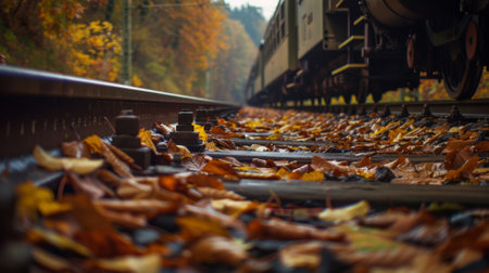 This captivating image features a tranquil railway track disappearing into the distance, flanked by vibrant autumn trees and set beneath a dramatic, cloud-filled sky, evoking a sense of journey and adventure. AI generated image