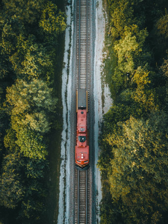 From a bird's eye view, a train snakes through a lush and verdant forest, surrounded by towering trees and a natural landscape. AI Generative AI.